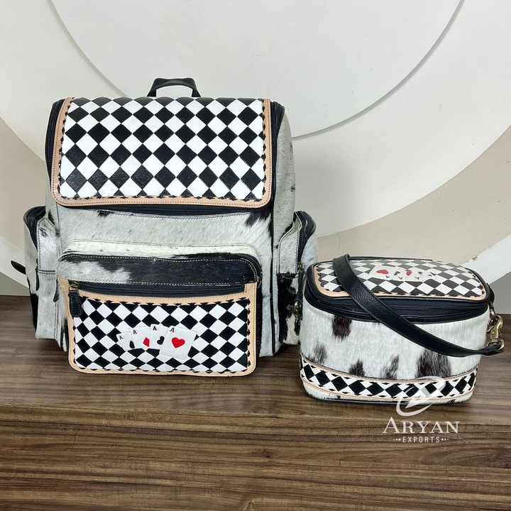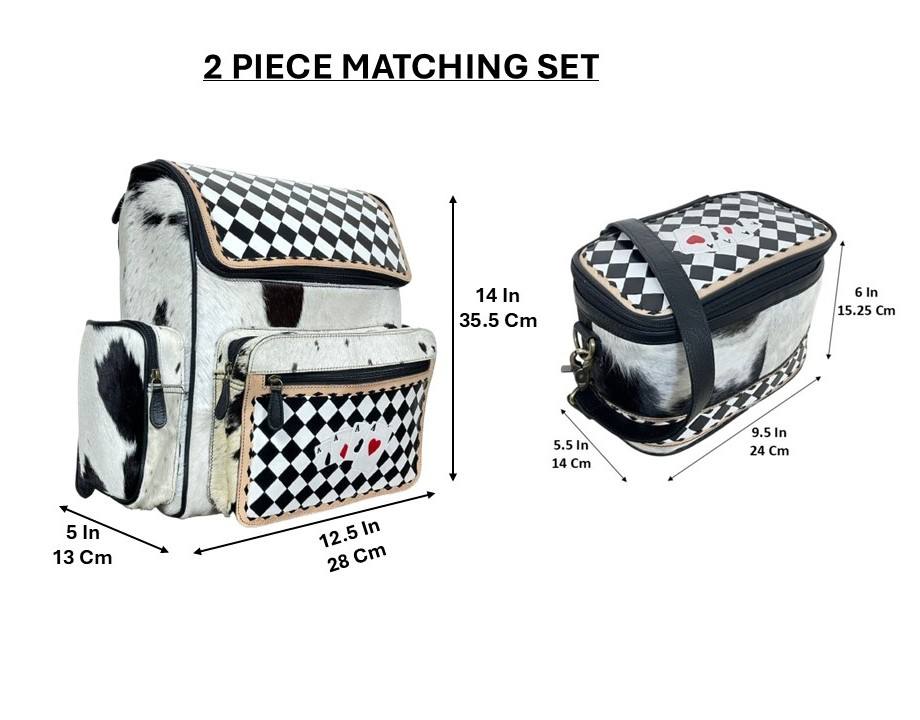 Checkered Leather Backpack with Cosmetic Bag Set