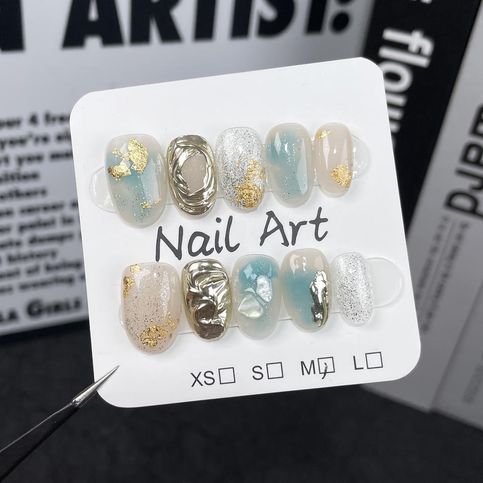 Nouveau produit lancé, teinture bleue au sel de mer, doré et scintillant, bloc de glace transparent et 3D, ongles portables faits à la main