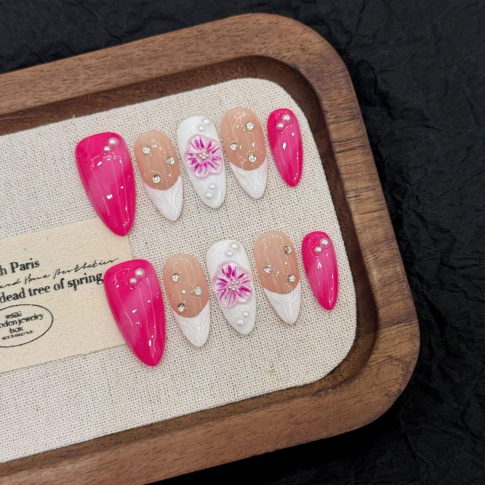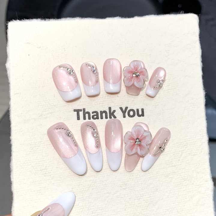 Nouveau produit lancé, Ongles à poser faits main, style français, effet œil de chat, sculptés en 3D, motif Nénuphar, délicats et purs