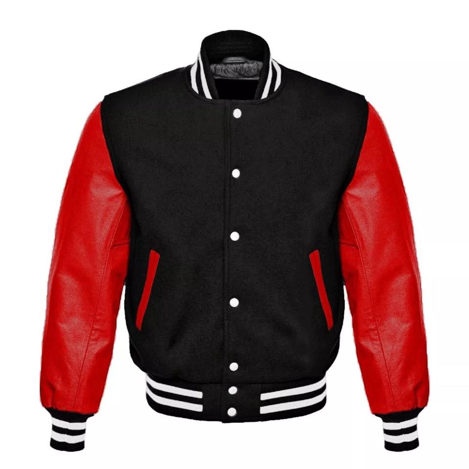 Nouvelle veste universitaire de baseball en laine noire véritable avec manches en cuir rouge, style Letterman