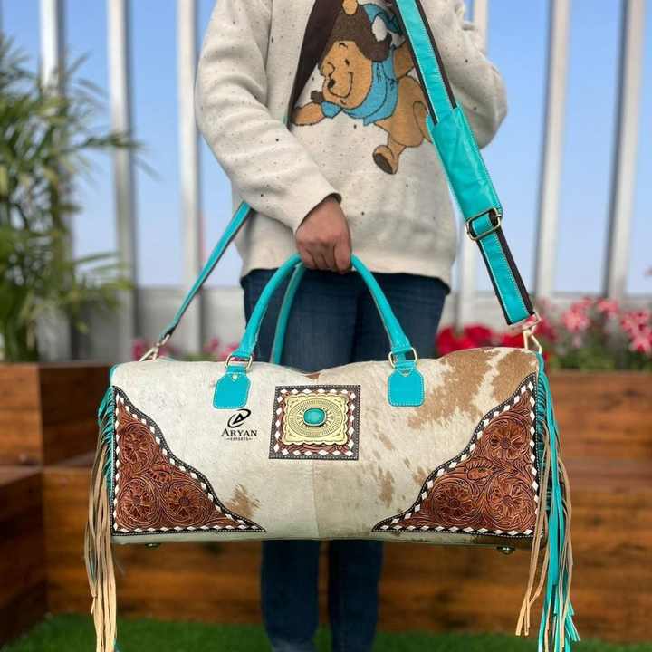 Type:Stylish Tooled Cowhide Leather Turquoise Duffel Bags