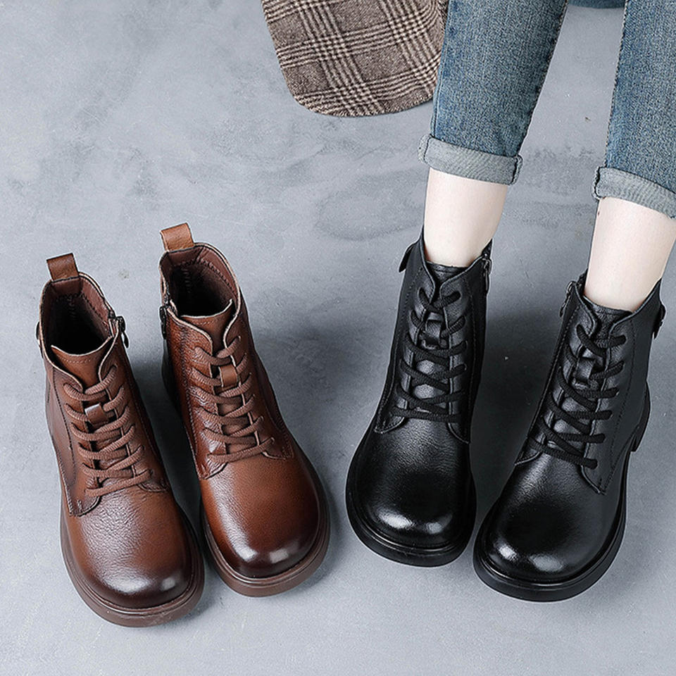 Nouveau rétro peau de vache hiver talon bas Martin bottes en cuir véritable Style britannique bottes courtes pour les femmes