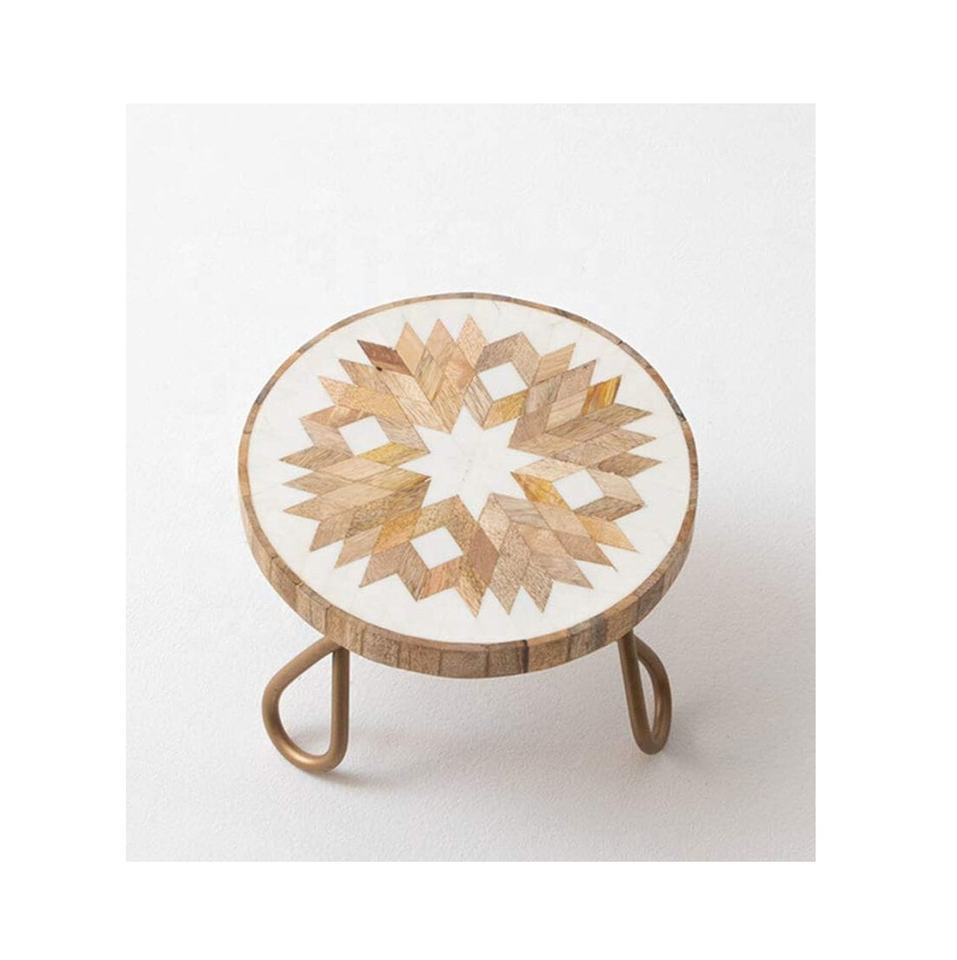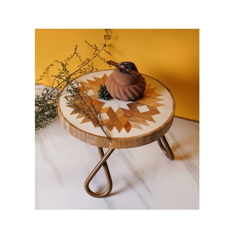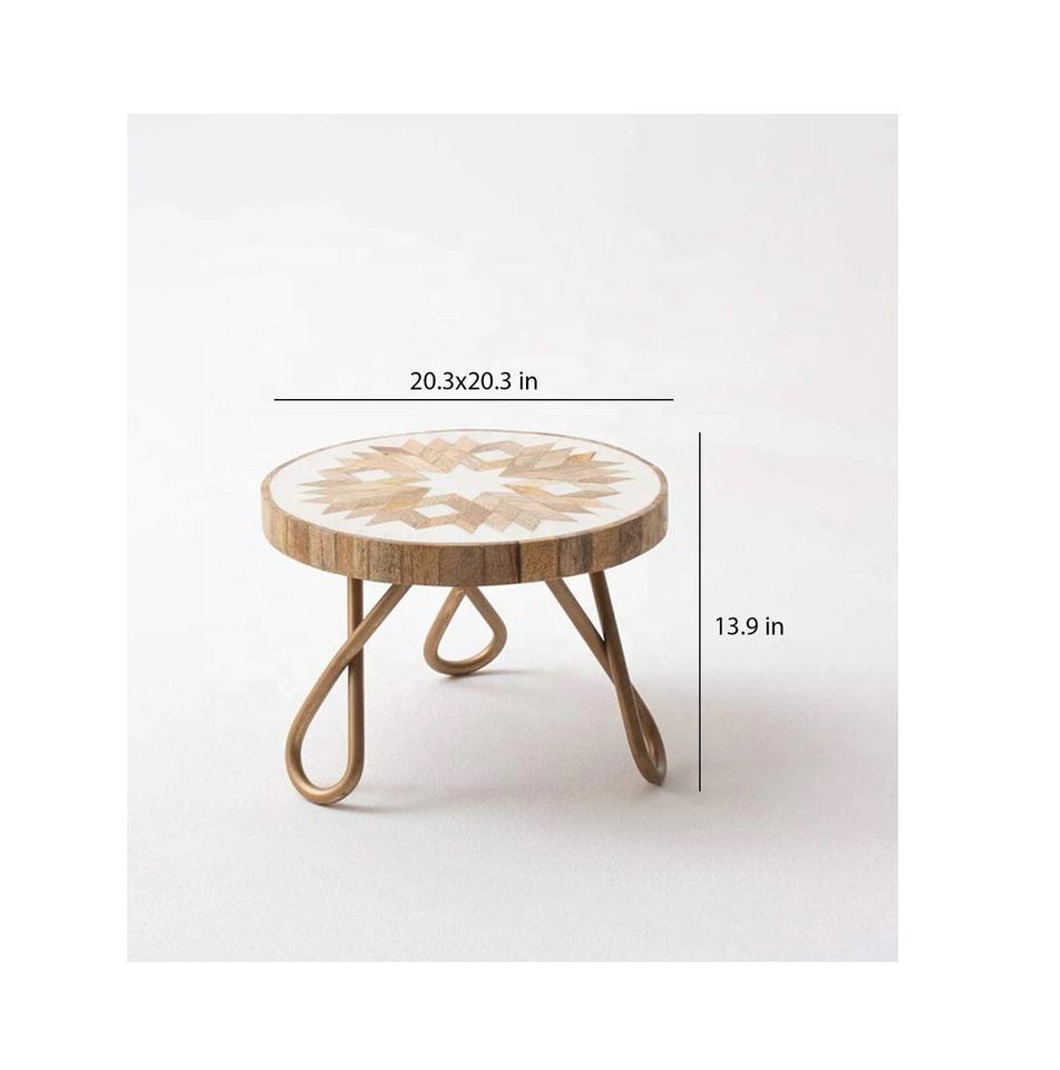 Nouveau support à gâteau rond en bois imprimé avec pieds en métal fabricant grossiste support à gâteau Royal avec couvercle maison et décoration
