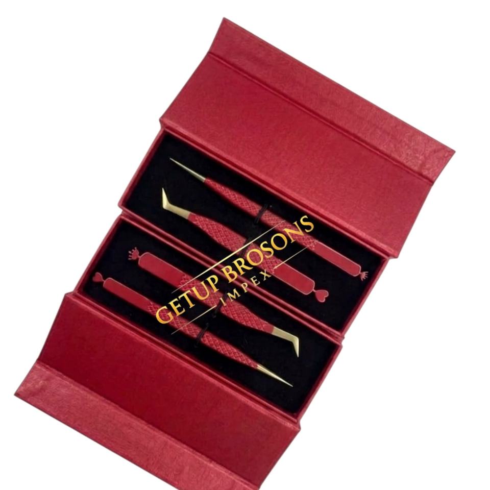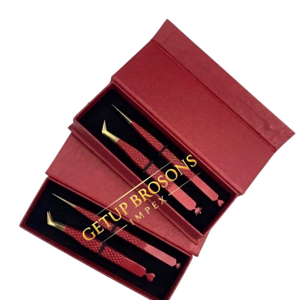 Nouvelles pinces à extensions de cils russes à volume, revêtement en poudre rouge, pointe dorée longue et droite, différents motifs de découpe, outils de beauté