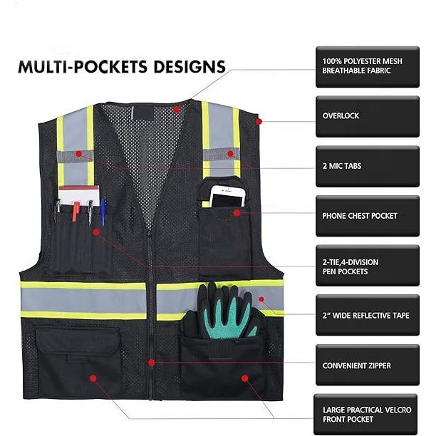 Nouveau gilet de sécurité avec fermeture éclair gilet en maille réfléchissante haute visibilité pour hommes ANSI classe 2 gilet haute visibilité avec 8 poches et fermeture éclair