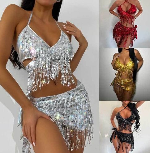 New Slit Swimsuit Women's Sequin Fabric Sexy Tassel Bikini Three-Piece Swimwear