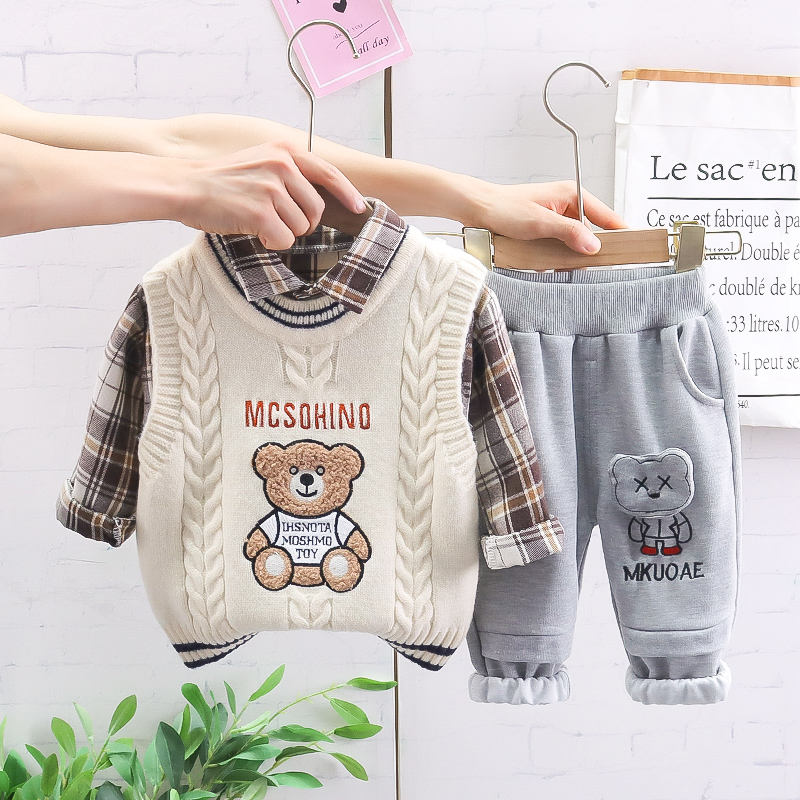 Nouveau printemps automne 3 pièces garçons vêtements ensemble dessin animé ours pull gilet à manches longues chemises à carreaux coton pantalon bébé vêtements