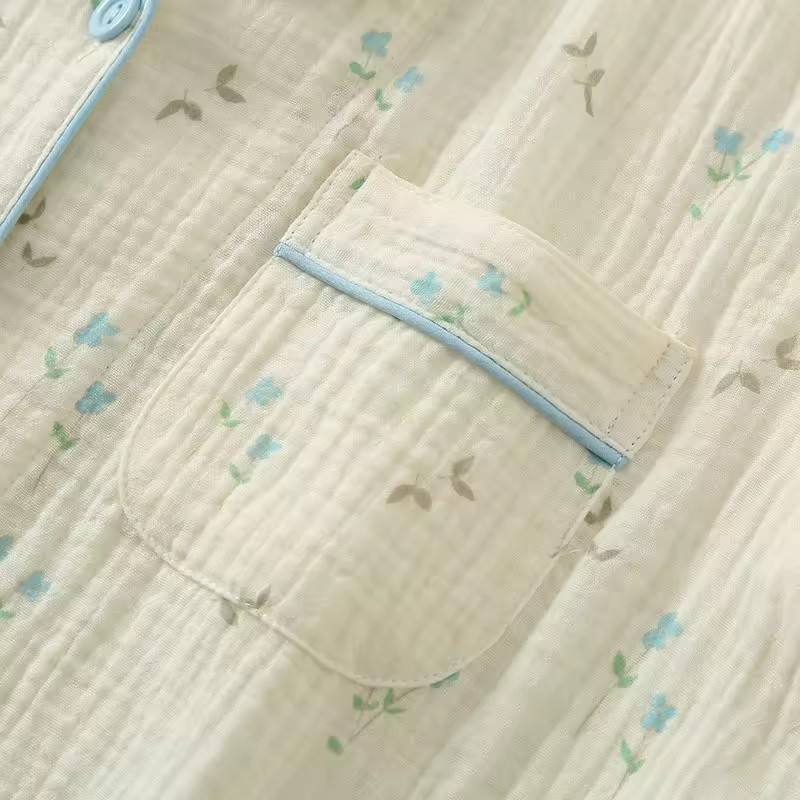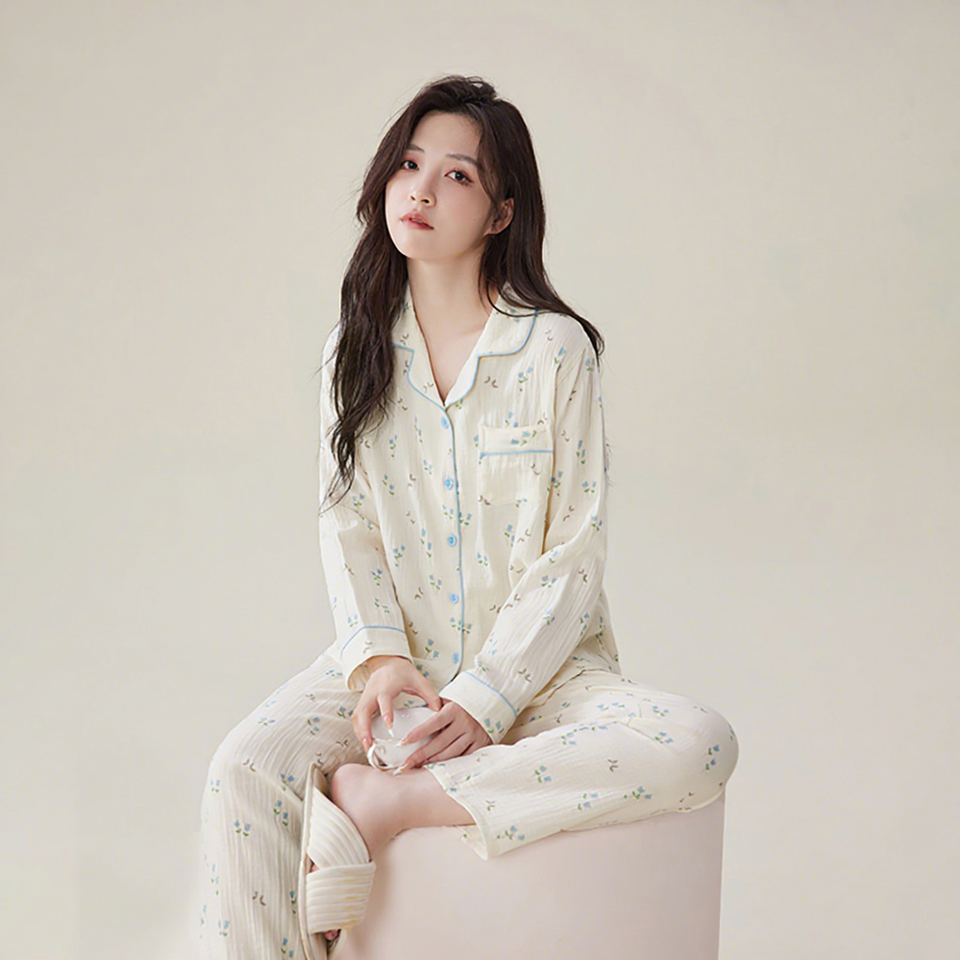 Nouvel Ensemble de Pyjama Femme en Gaze Double Couche Printemps/Automne, Col Rabattu, Prêt-à-Porter, Manches Longues 100% Coton