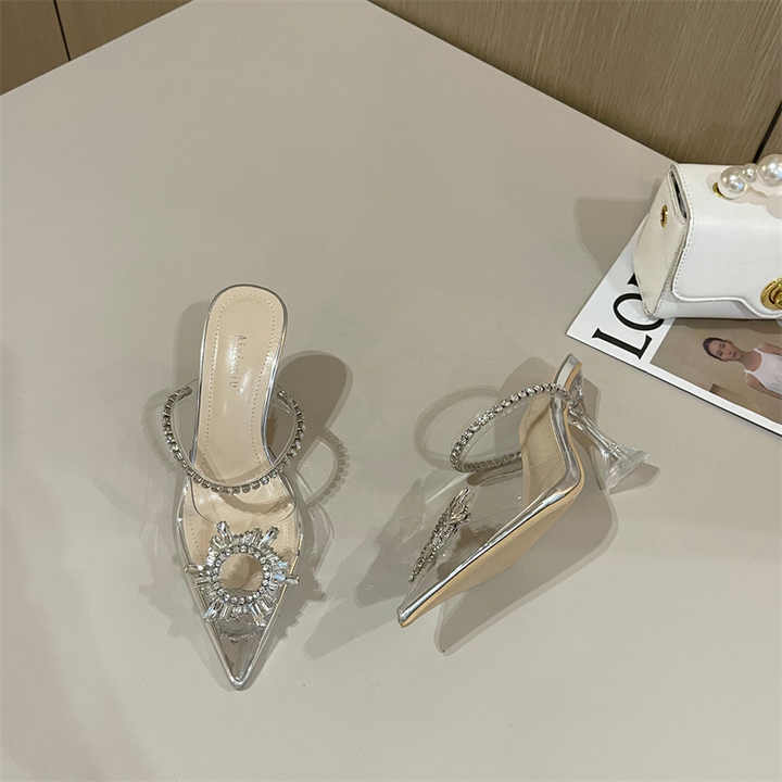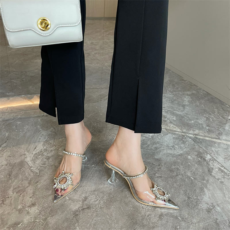 Nouvelles mules pour femmes, printemps, avec nœud en cristal brillant, bout pointu, talon fin, chaussures pour femmes
