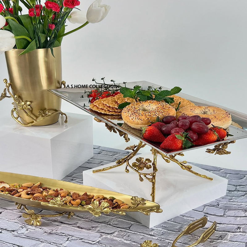 Nouveau Style Usine Vente Ovale De Luxe En Bois Plateau De Service pour Chocolat Gâteau Aux Fruits Dessert Golden Leafy Poignée En Métal