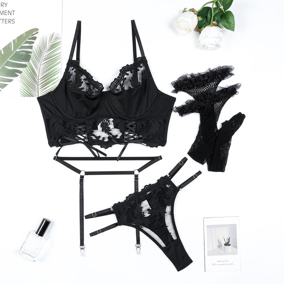 Nouvel ensemble de lingerie en dentelle patchwork brodé floral de couleur unie, vente en gros, ensemble de sous-vêtements exotiques pour femmes