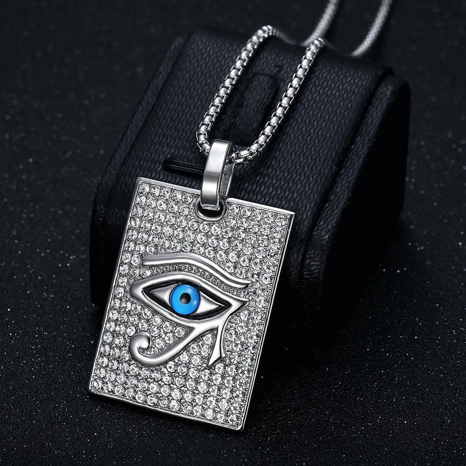Collier avec pendentif œil d'Horus en forme de plaque carrée, chaîne cubaine perlée de style hip-hop, chaîne tressée