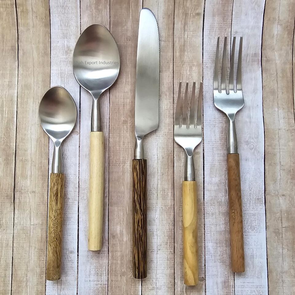 Ensemble de couverts en métal de style nouveau avec manche en bois d'acacia fini argent pour la maison et les ensembles de couverts de vaisselle de mariage
