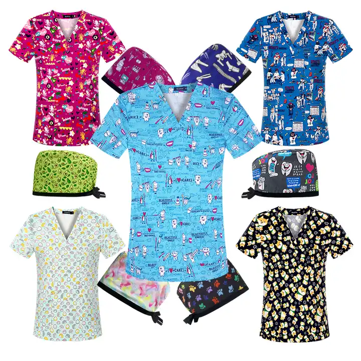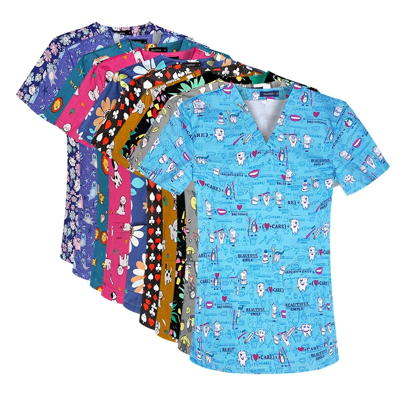 Nouveau Style à manches courtes col en v haut de gommage femmes imprimé fleuri vêtements médicaux haut noël gommage travail tissu uniforme infirmière gommage