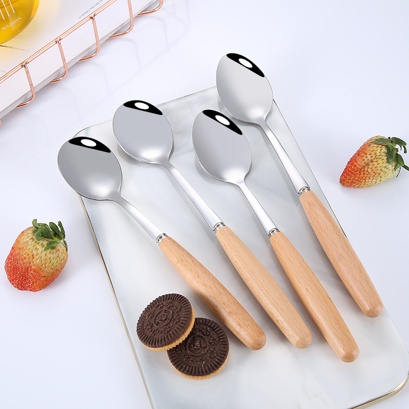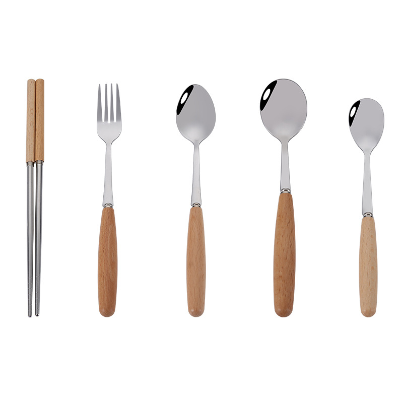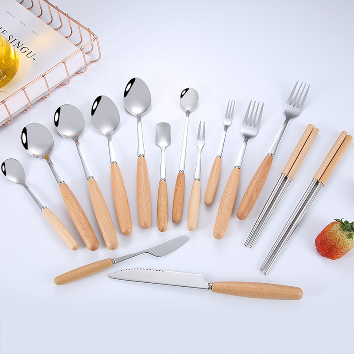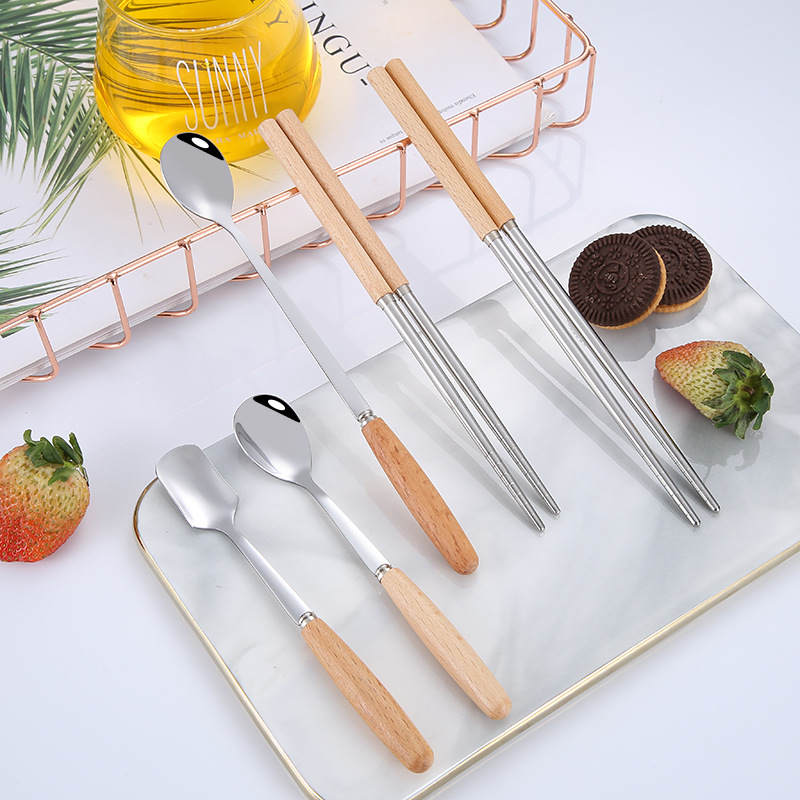Ensemble de couverts en acier inoxydable de nouveau style argenterie baguettes fourchette cuillère couteau manche en bois ensemble de couverts avec boîte-cadeau