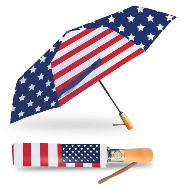 Nouveau style de parapluie pliable avec imprimé drapeau américain, logo personnalisé, résistant au vent, poignée en plastique de bonne qualité, ouverture manuelle, entièrement automatique