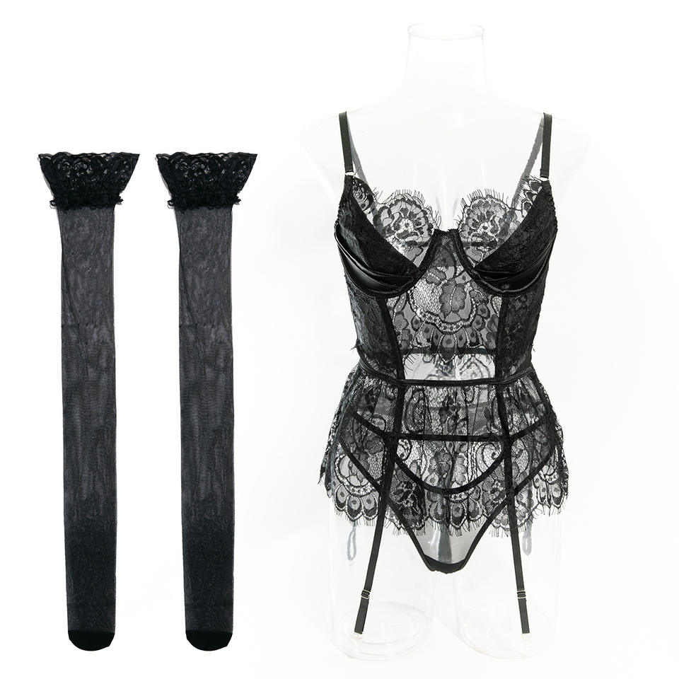 Nouvel ensemble de lingerie ultra-fin en dentelle brodée ajourée en polyester/nylon, avec bas et porte-jarretelles sexy et érotique