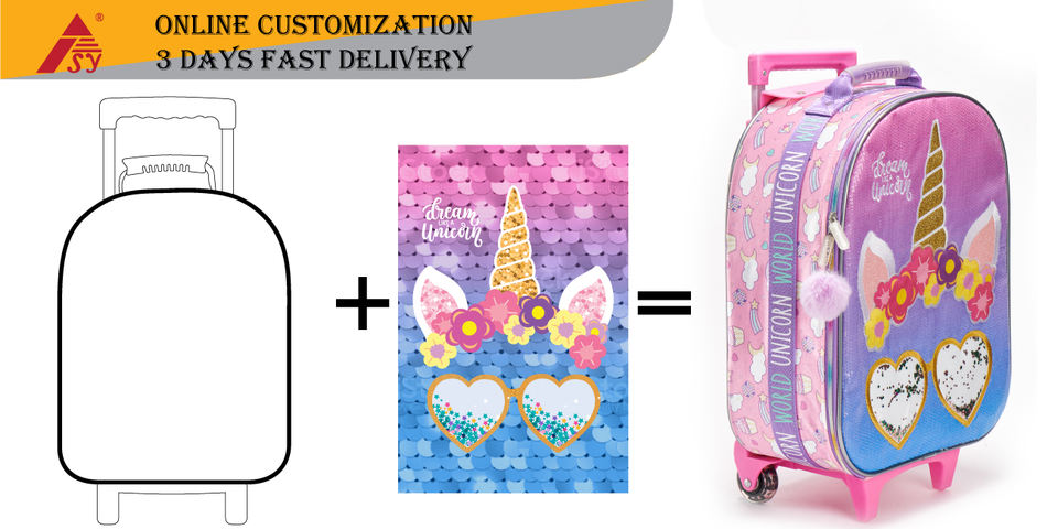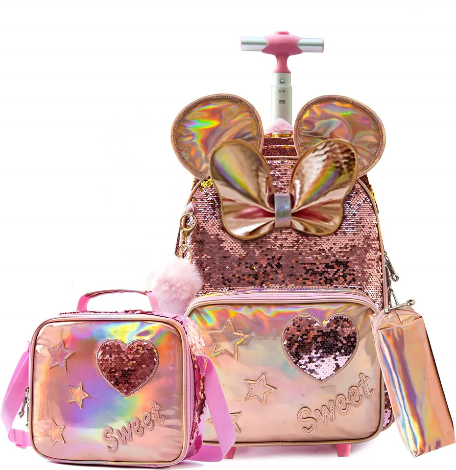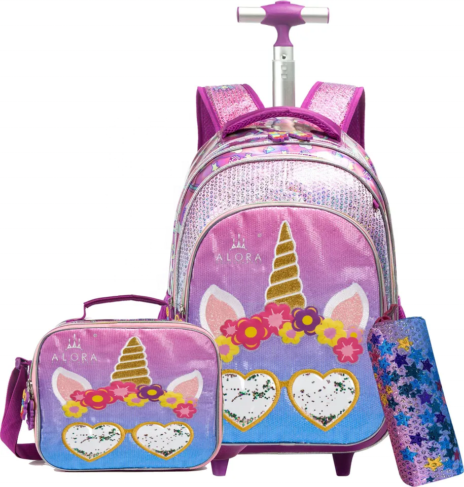 Nouveau style licorne tige de traction sac à dos ensemble pour filles école roulant mode haute qualité trois pièces chariot sac