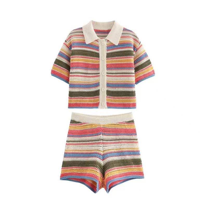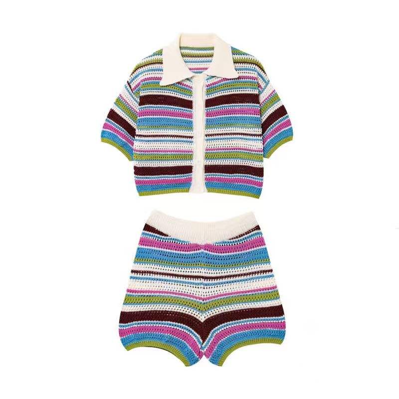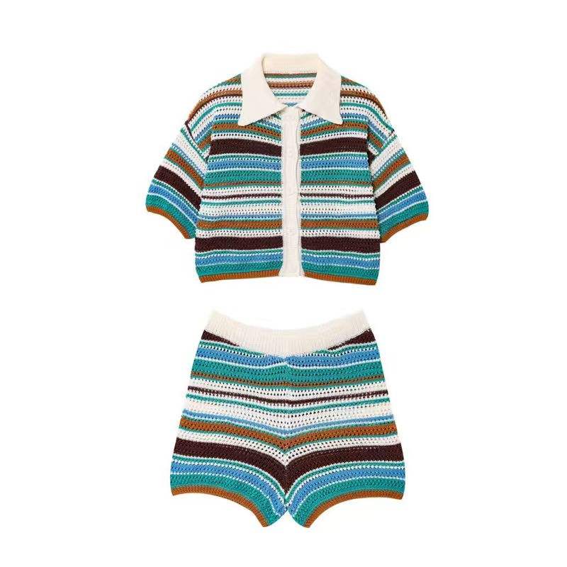 New Summer Casual Striped Pattern V-neck Single-breasted Woven Top and Shorts Set