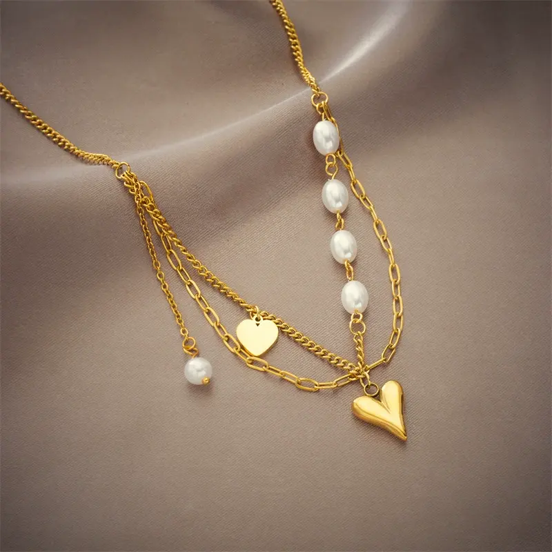 Nouveau sans ternissement en acier inoxydable 18k plaqué or Double couche coeur pendentif mode bijoux colliers pour femmes