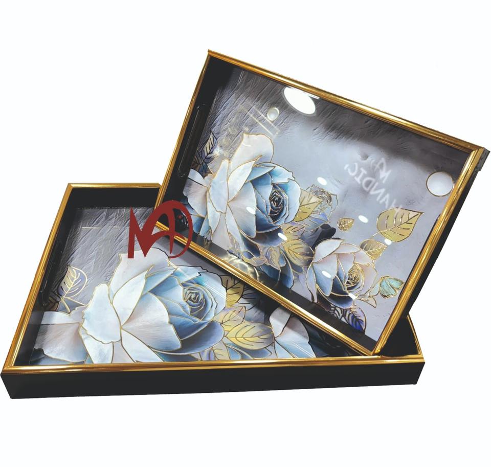Nouveau plateau plateau en verre au design abstrait plateau de service couleur bord doré avec poignées verre aspect luxe