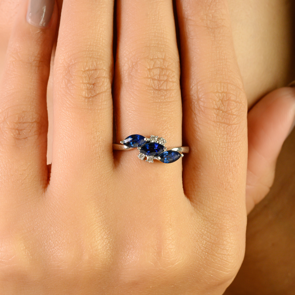 Nouvelle collection tendance, bague à trois pierres en saphir bleu et diamant, sertie à griffes, or véritable 14 carats, pierre de naissance de septembre, bijoux
