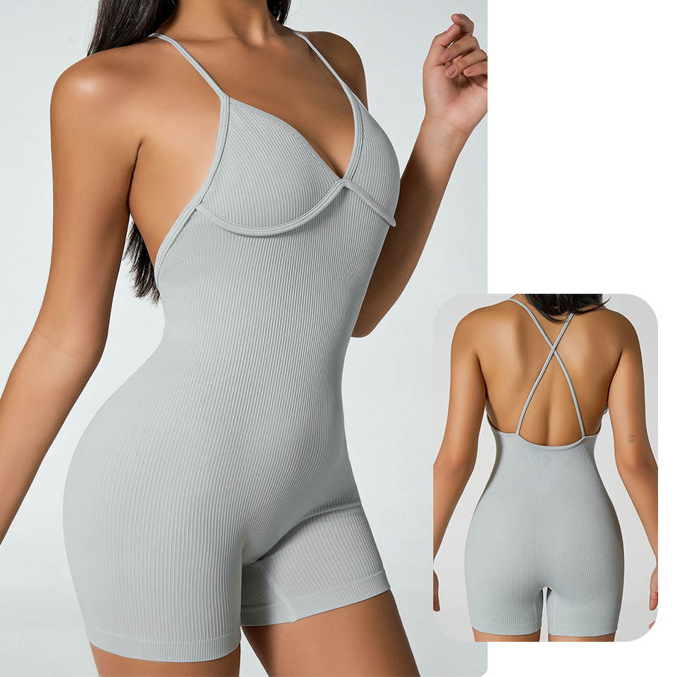 Nouvelle Combinaison de Sport Sans Couture Côtelée et Dos Nu avec Logo Personnalisé pour Femme – Idéale pour le Fitness et l'Entraînement en Salle de Sport
