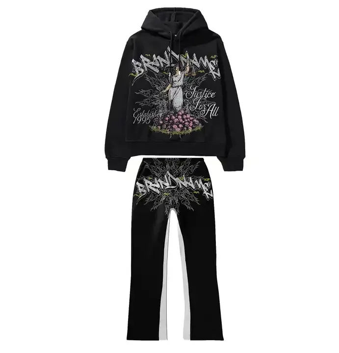 Nouvel ensemble tendance vintage surdimensionné imprimé sérigraphié en coton tissé 100% de haute qualité, style hip-hop, avec pantalon de survêtement évasé et sweat à capuche en molleton pour l'hiver