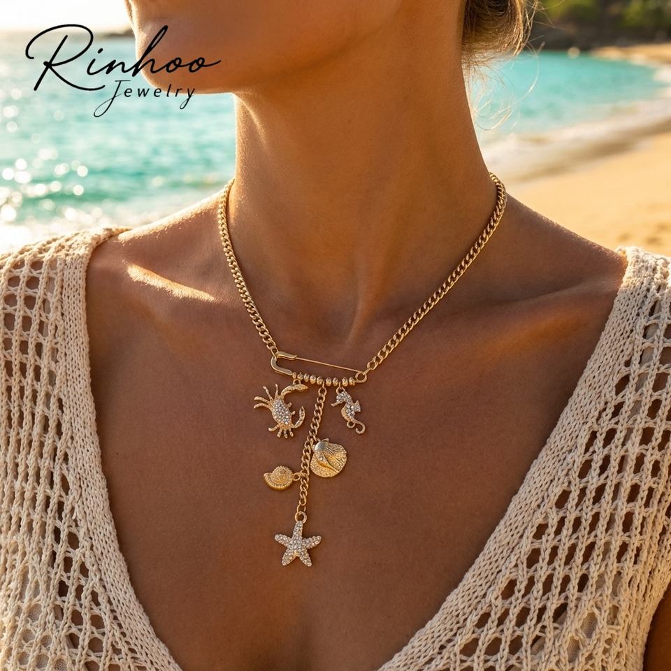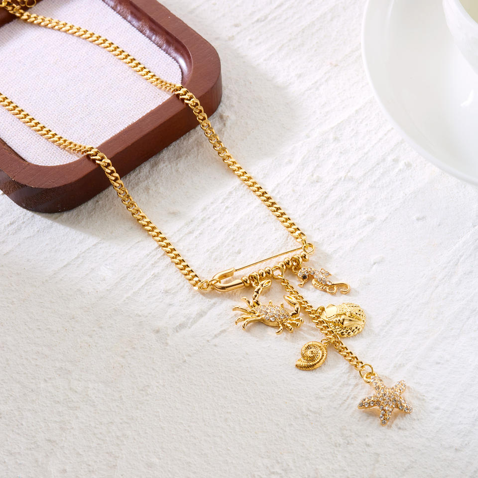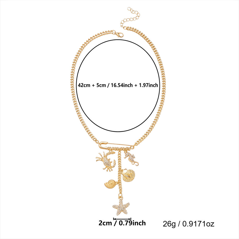 Nouveau Collier Tendance pour Femme avec Pendentifs Épingle à Cravate, Strass, Étoile de Mer, Pompon, Épingle de Sûreté Créative, Crabes et Hippocampes, Bijoux