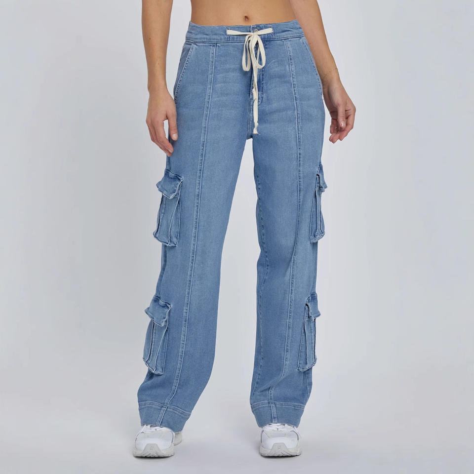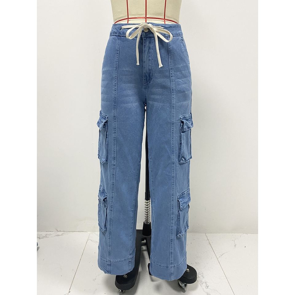 New Washed Multi-Pocket Wide-Leg Lace-Up Women's Jeans Fashion