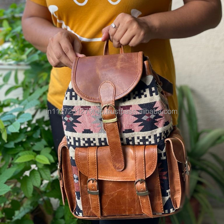 New Western Boho Style Vintage Handmade Jacquard Leather Drawstring Backpacks Hand Stitch Klim Genuine Leather Indian Style Bags