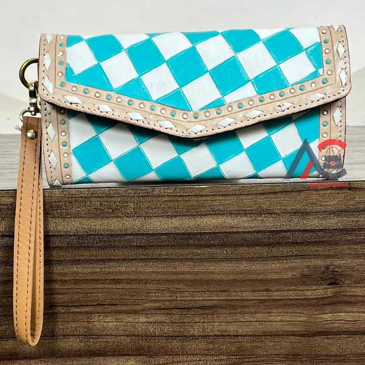 Product name:Hand Tooled Checkered Leather Wristlet Wallet