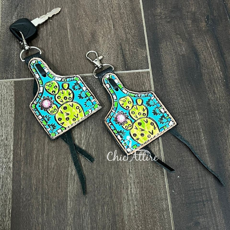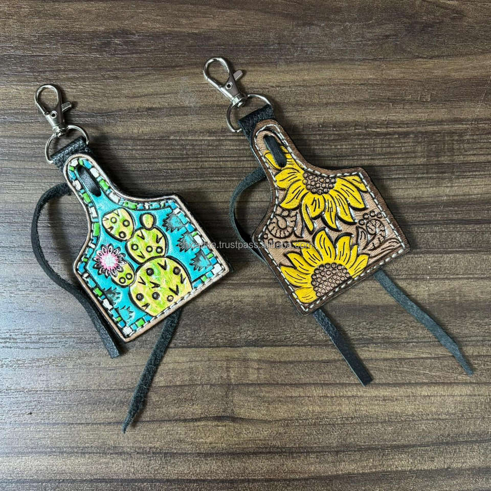 New Western Hand Tooled Leather Cow Tag Keychain Hand Painted Sunflower & Cactus Key Fob Durable Key Holder for Bags Keys Gifts