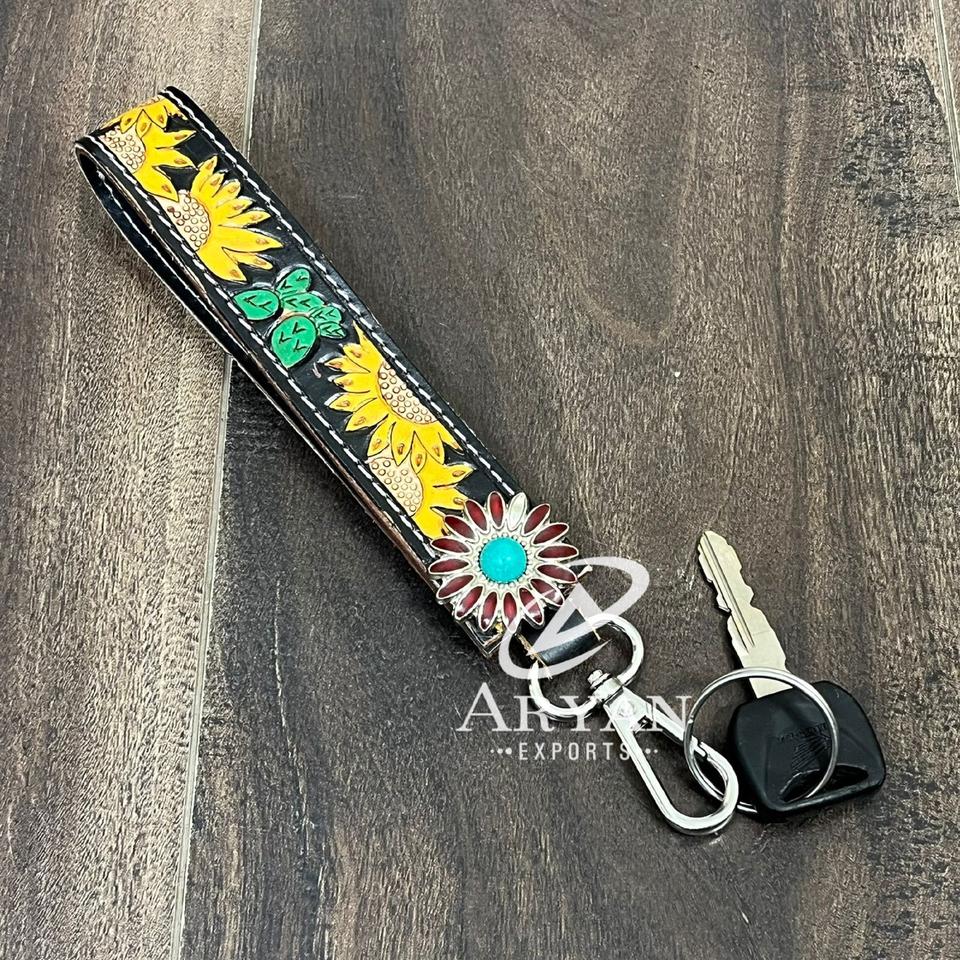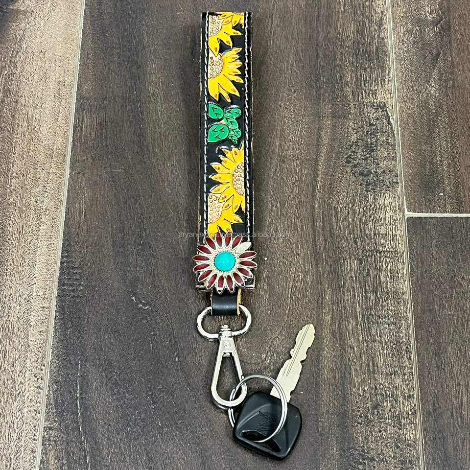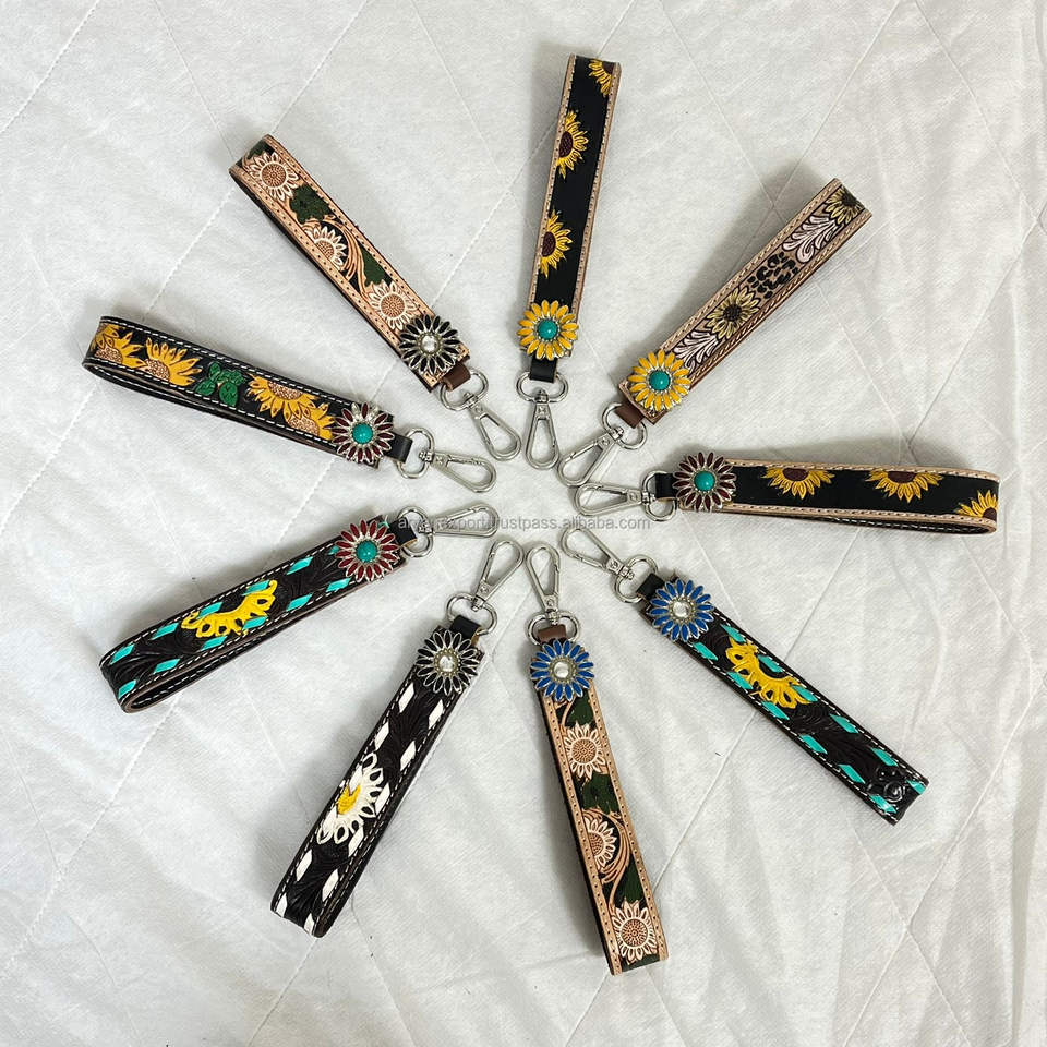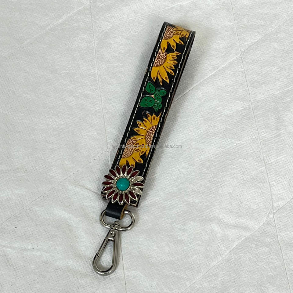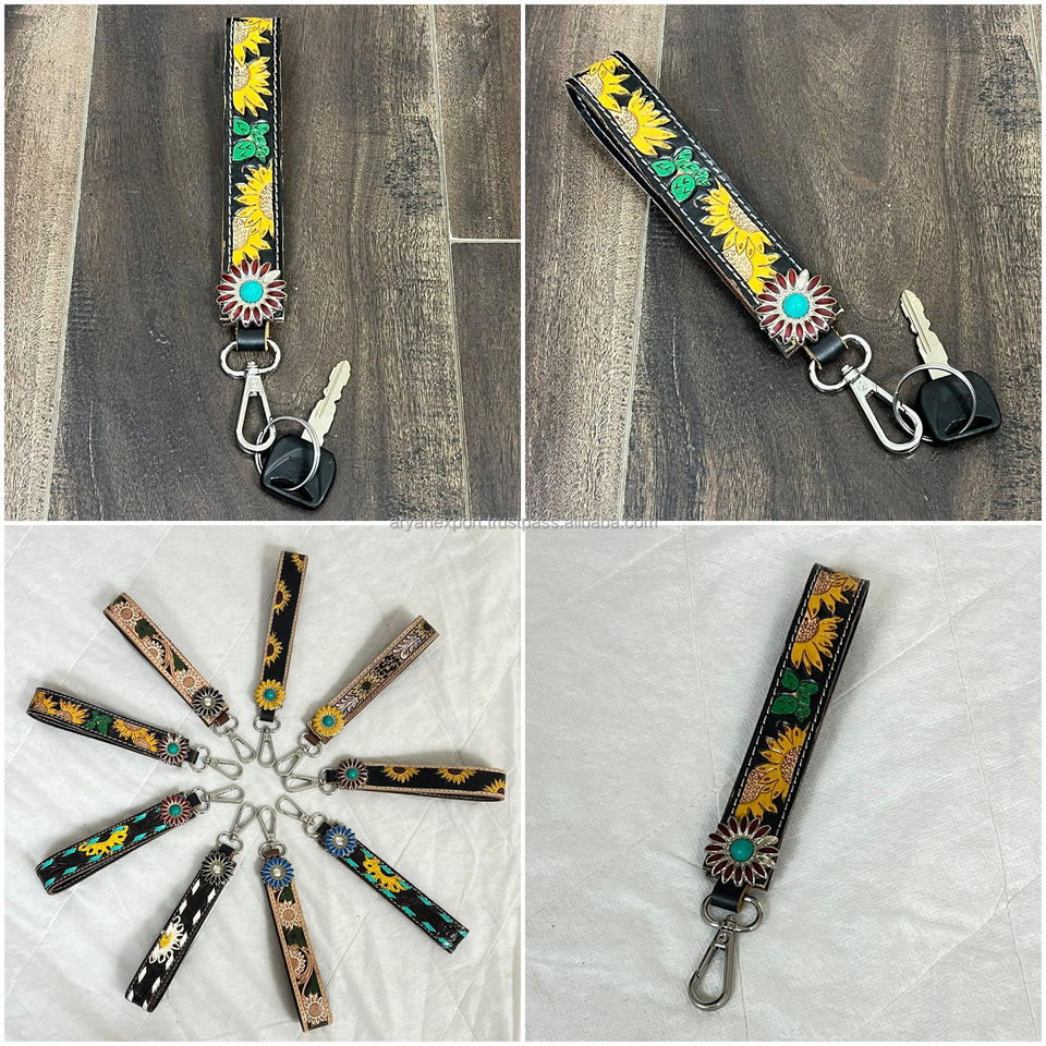 Nouveau porte-clés en cuir de vachette véritable de style western, fait main, avec motif floral et fermoir métallique, pour femmes