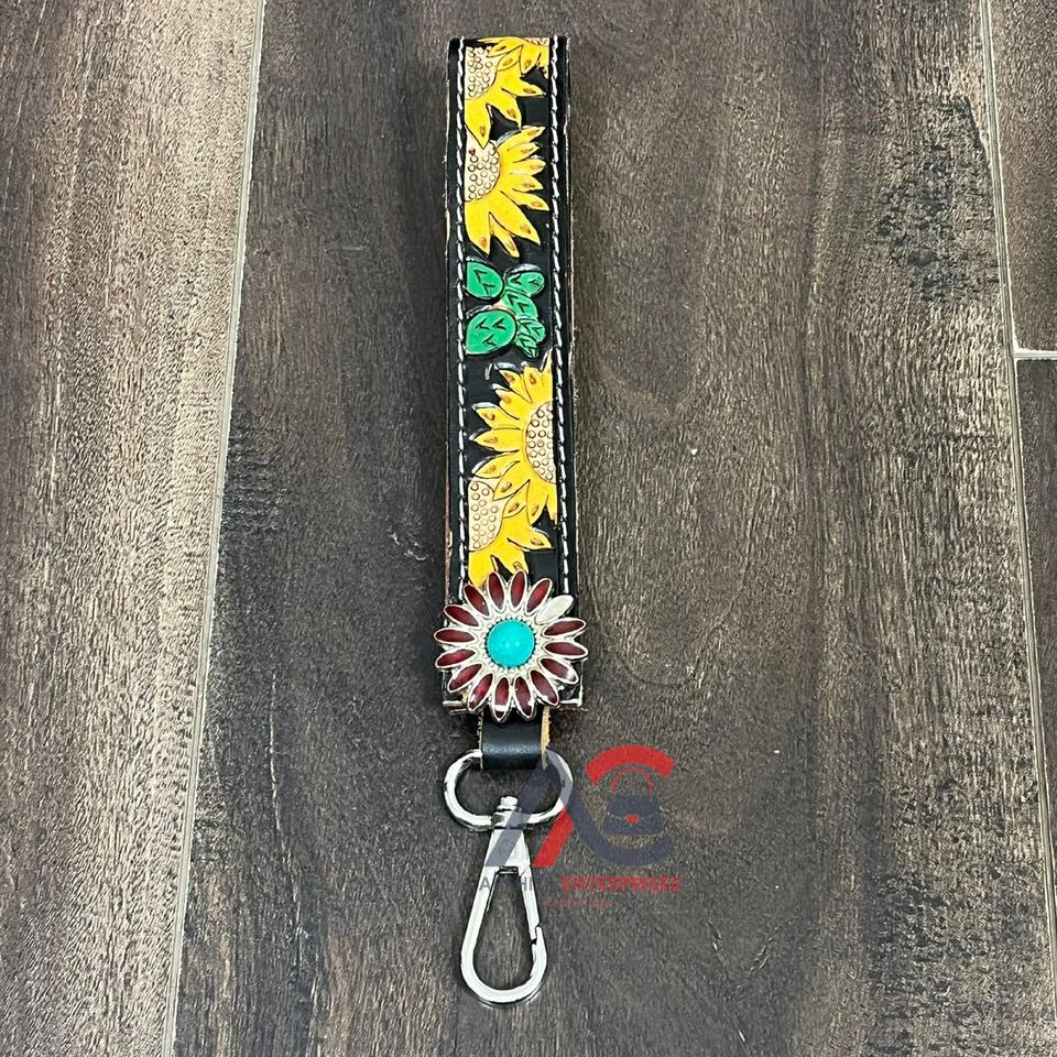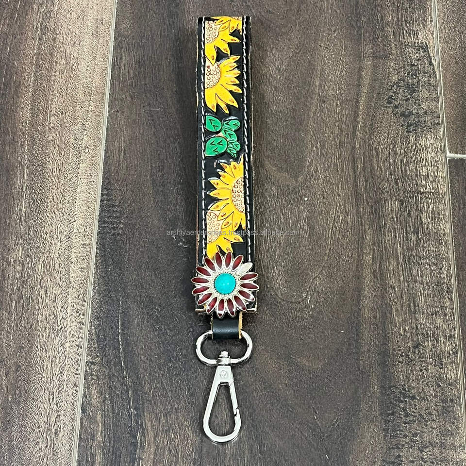 Nouveau porte-clés en cuir de vachette véritable de style occidental, fait main, avec motif floral et fermoir métallique, pour femmes