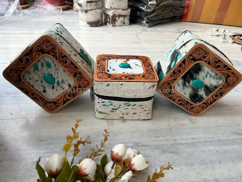 Nouveau Western élégant fabriqué à la main usiné métallique fourrure cuir boîtes à bijoux bijoux essentiels étuis minimes avec pierre Turquoise