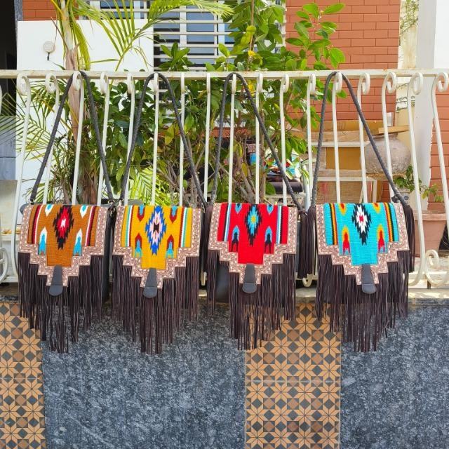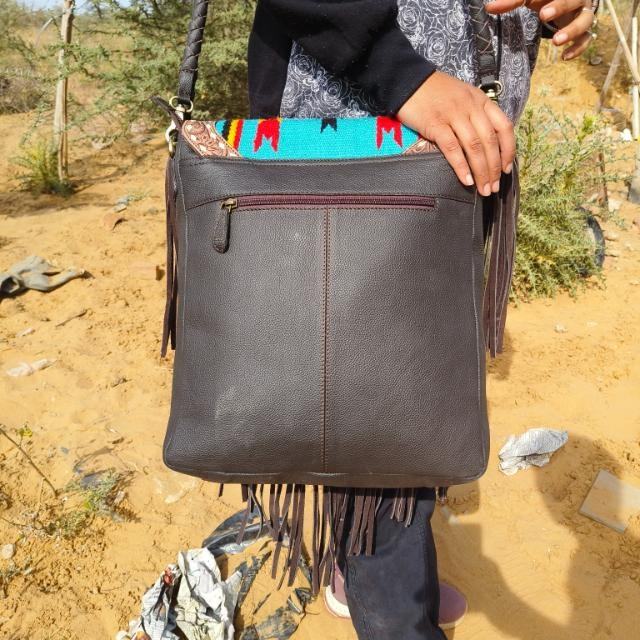 Nouveau Western Vintage Style Aztèque Bleu En Cuir Véritable Sac À Bandoulière Mince Long Portefeuille Perlé Sangle Gland Zipper Handcrafted Girls