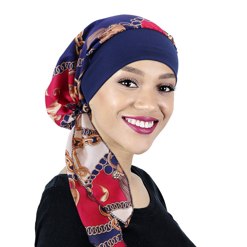 Nouveau bonnet chimio pour femme en ruban de soie simulée, imprimé numériquement, longueur moyenne
