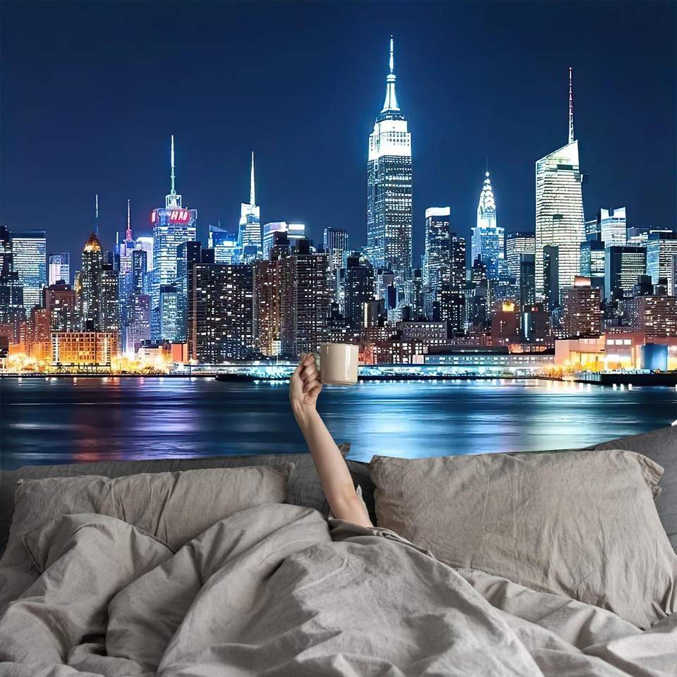 New York Skyline Tapestry White Clouds and Sunlit Business Centers Window View Wall Hanging Art for Outdoor Home Decor