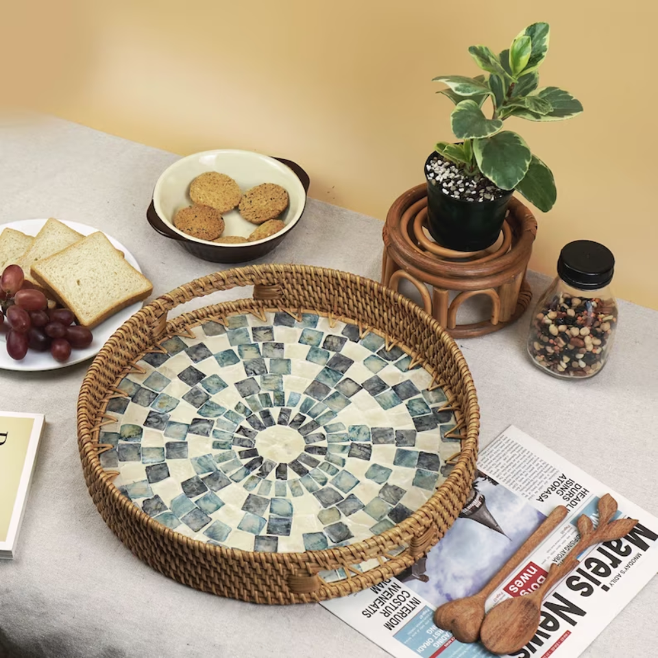 Round Mother of pearl Inlaid Rattan TrayProduct Name