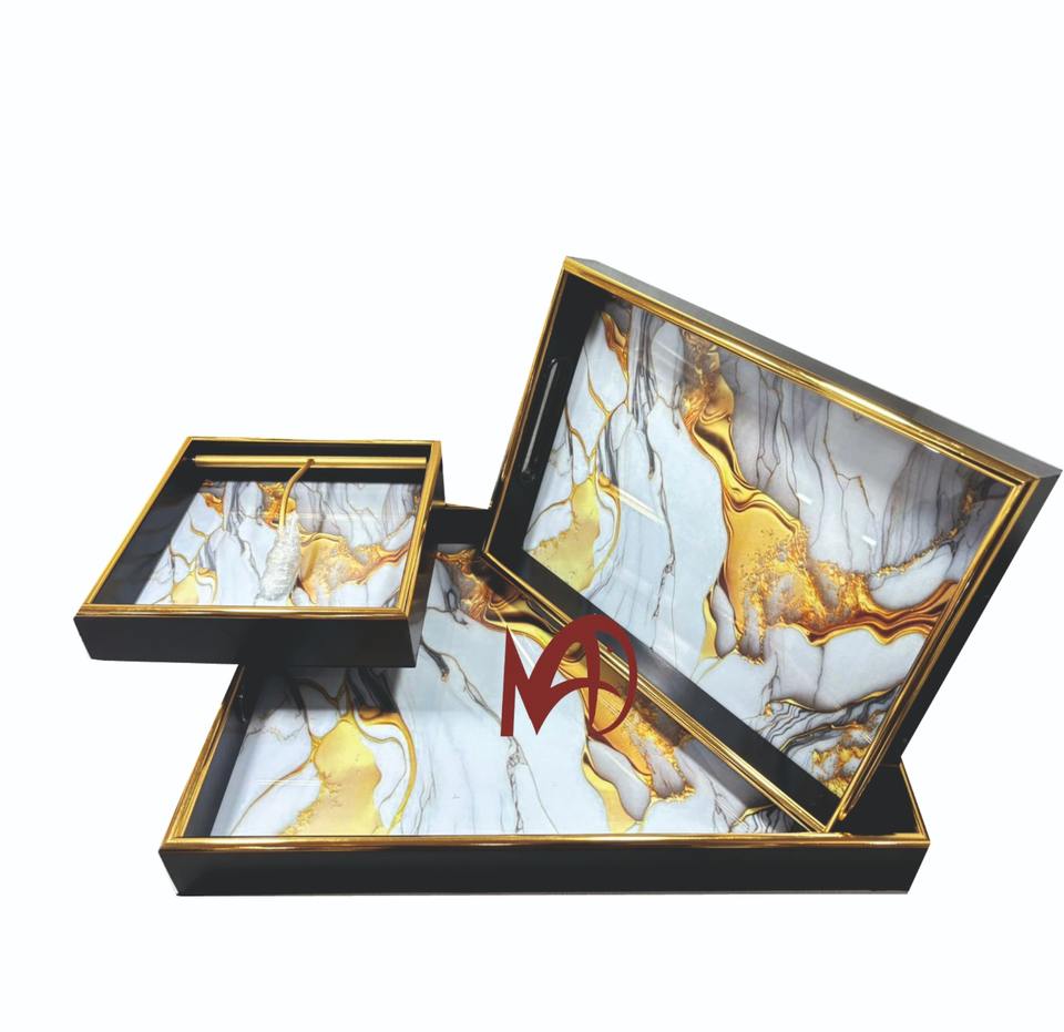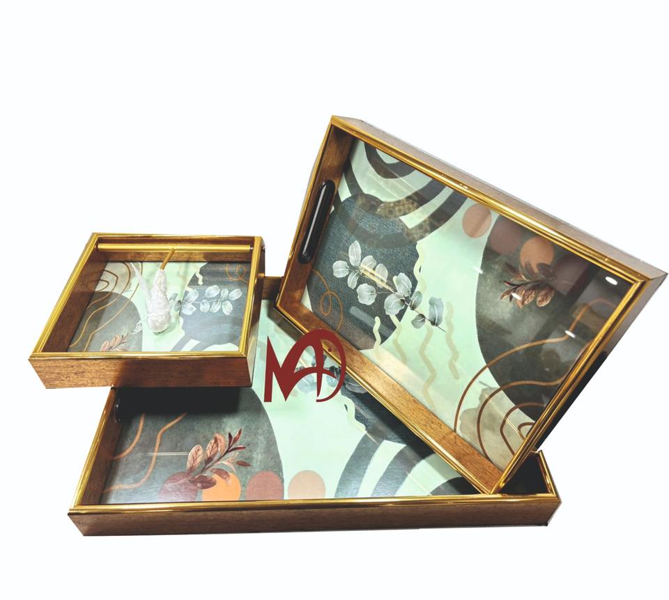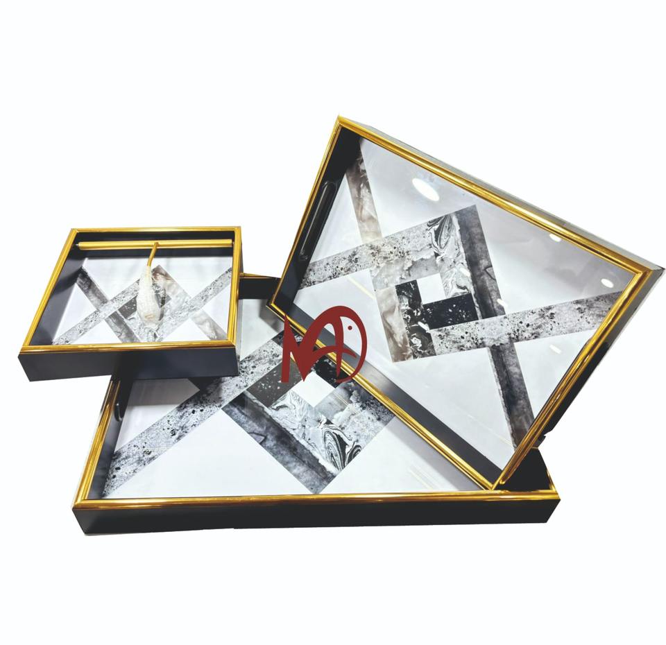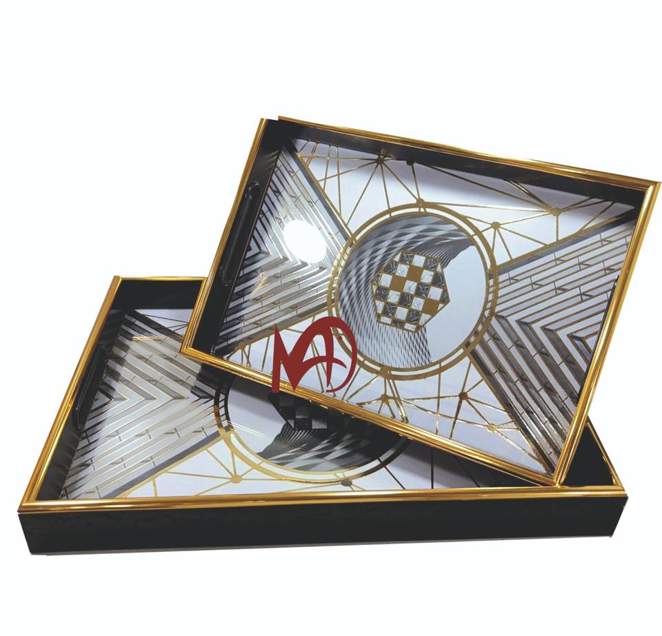 Luxury Look Glass Serving Tray with Golden Edge New Abstract Design and Handles Elegant Luxury Serving Tray