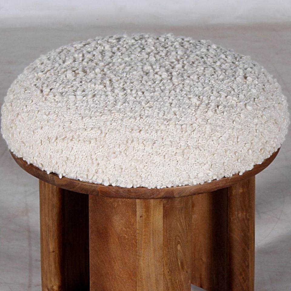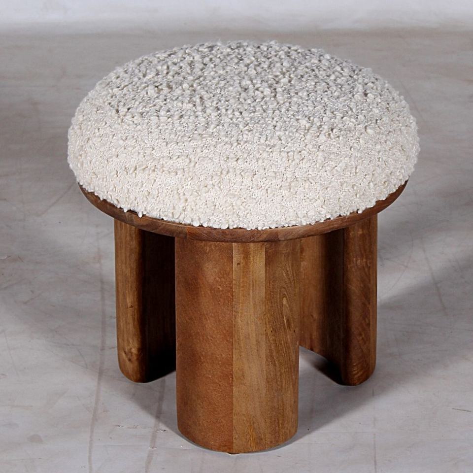 Nouvelle tendance : pouf rond en bois de manguier fait main, couleur blanche, avec boucle en tissu, trois pieds, pour salon et autres