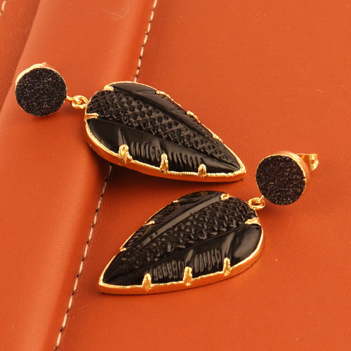 Newest Collection Natural Sugar Druzy & Black Quartz Leaf Carving Stud Dangle Earring Brass Gold Plated Two Tier Dangle Earrings