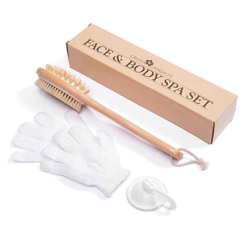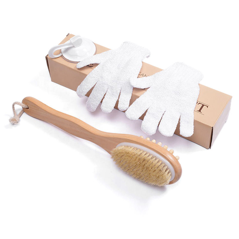Nouveau design de poils de sanglier naturels, nettoyage de la peau sèche et humide, manche en bois, brosse corporelle et ensemble de gants