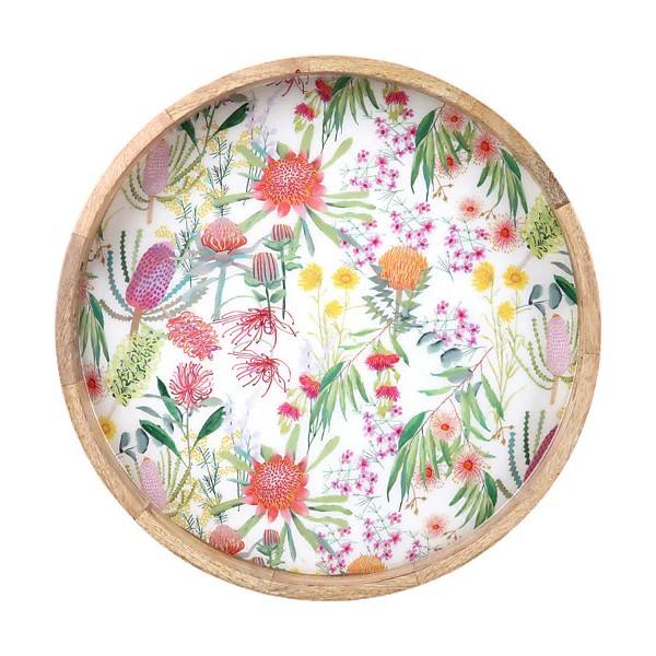 Newest Design Wooden Serving Tray with Colorful Floral Printed Pattern Round Vintage Decorative Tray for Kitchen Coffee Table