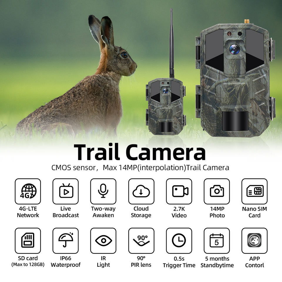 Nouvelle caméra de chasse sans fil 4G LTE, 14MP, 2.7K HD, étanche IP66, vision nocturne, contrôle par application, carte SD, prix usine
