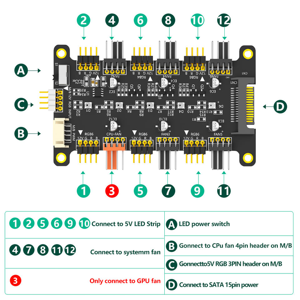2 en 1 6 voies 12V ARGB et 12V PWM DC Fan Hub