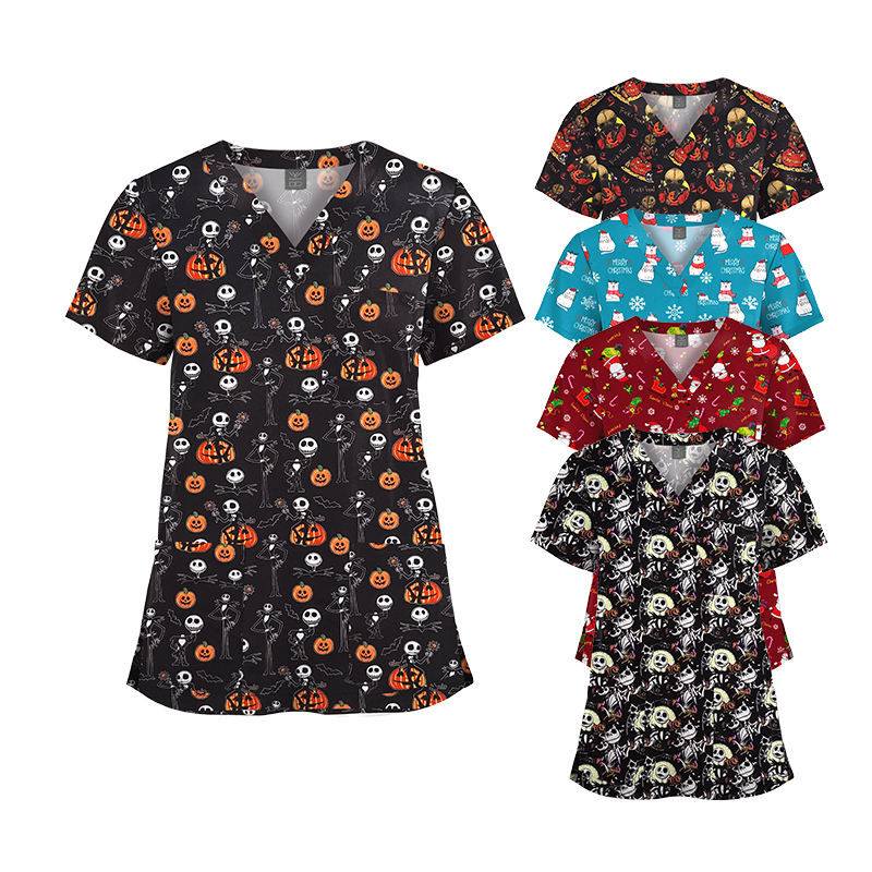 Nouvellement meilleure vente tissu lavable doux tous les motifs d'Halloween imprimés hauts pour hommes et femmes infirmière imprimé Scrubs hauts