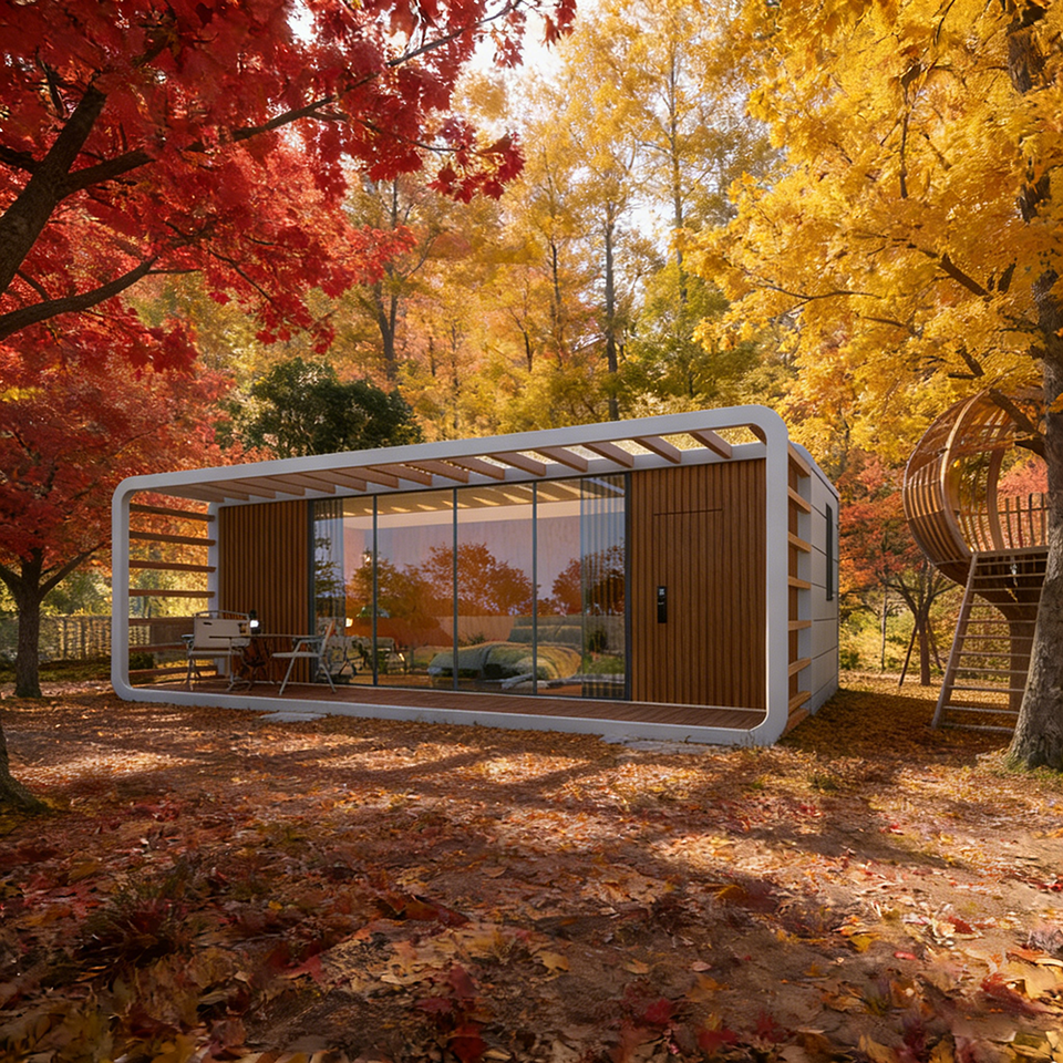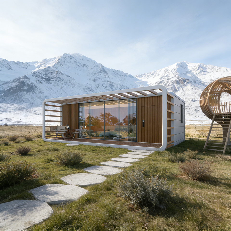 Capsule en acier préfabriquée mobile de conception nouvelle, une chambre, villa avec terrasse, salon, utilisation hôtelière, modulaire