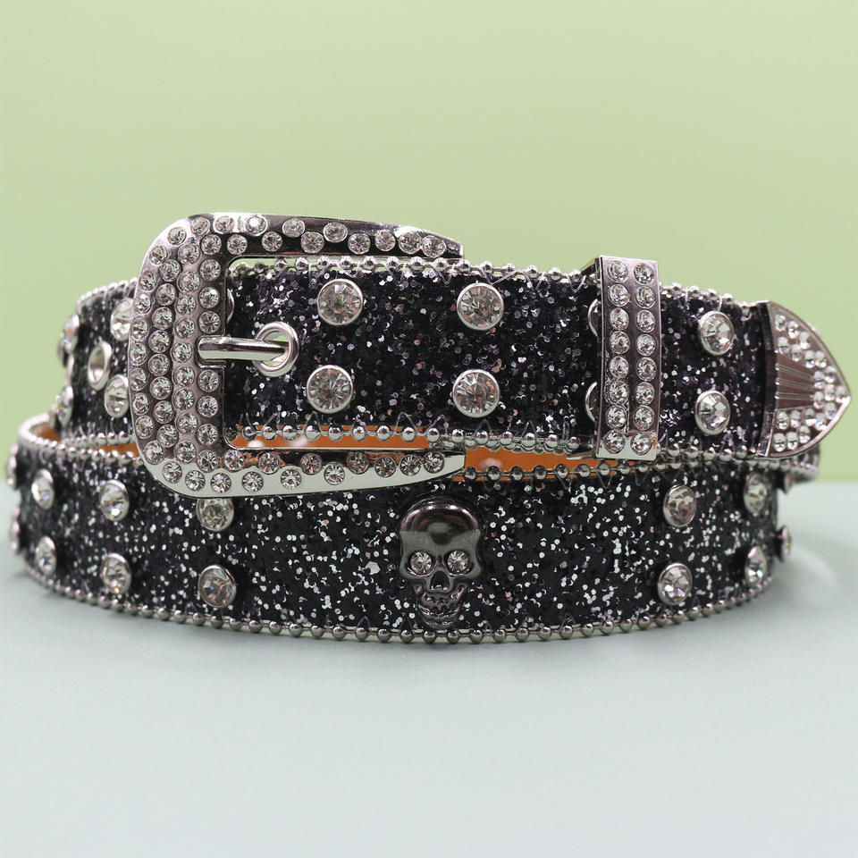 Nouvellement conçu rétro Style occidental blanc tricoté ceintures diamant étincelant Flexible ceinture crâne PU grande boucle ceinture extérieure